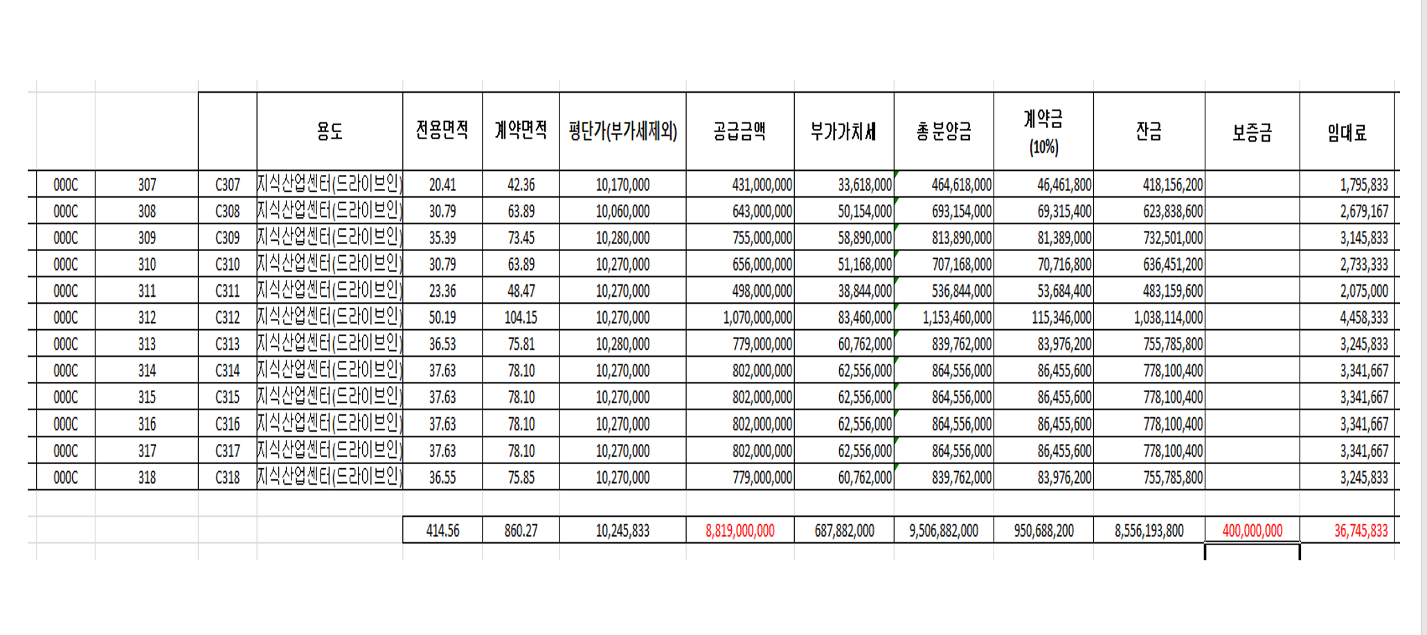 대형면적 (실평수) 400평 이상은 매물이 많이 계약된 상태 입니다.